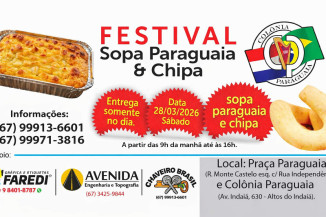 A Colônia Paraguaia de Douradospromove no dia 28 de março o Festival da Sopa Paraguaia e Chipa, evento gastronômico que valoriza sabores tradicionais da cultura paraguaia. Durante o festival, o públic...