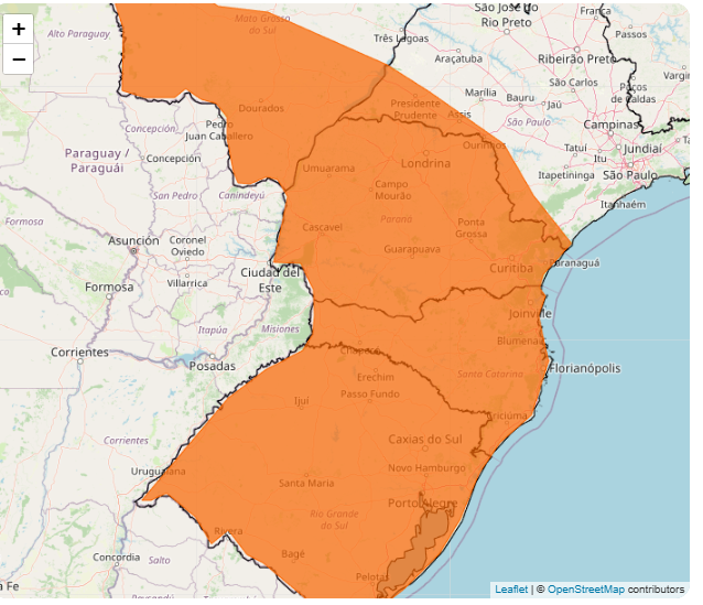 O alerta prevê chuvas entre 30 e 60 mm por hora ou até 100 mm por dia, além de ventos intensos de 60 a 100 km/h e possibilidade de queda de granizo.