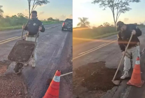 Um policial rodoviário federal foi flagrado tapando um grande buraco na BR-376, entre os municípios de Nova Andradina e Ivinhema, na tentativa de evitar acidentes no local. O fato ocorreu na tarde de segunda-feira (5) e nas imagens, é possível perceber o agente colocando resíduos como cascalho e pedras.