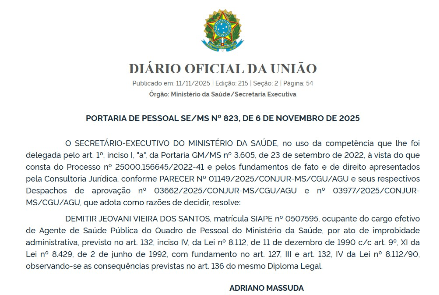 O Ministério da Saúde publicou a exoneração do vereador Jeovani Vieira dos Santos (PSDB), 59 anos, do cargo de agente de saúde no Governo Federal.
