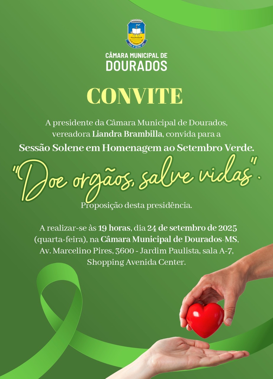 A Câmara Municipal de Dourados realiza, nesta quarta-feira (24), às 19h, no plenário da Casa de Leis, a Sessão Solene em alusão ao Setembro Verde, mês dedicado à conscientização sobre a importância da doação de órgãos e tecidos.